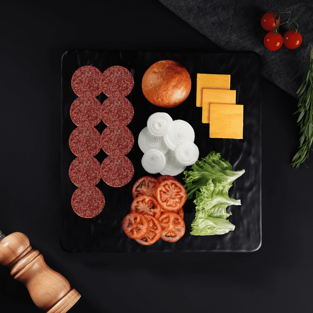 بوكس برجر يتكون من 9 قطع برجر + خبز+ شرائح الجبن + بصل + طماطم + خس لولو + كاتشب + صوص برجر + صوص سابيسي + مخلل خيار